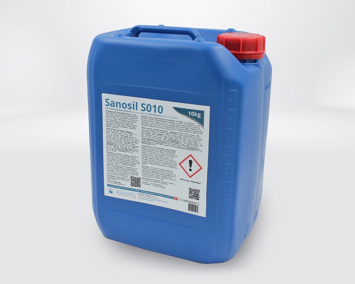 - Sanosil S010 – Surfaces fortement contaminées ou à hygiène renforcée — PT2, PT3, PT4