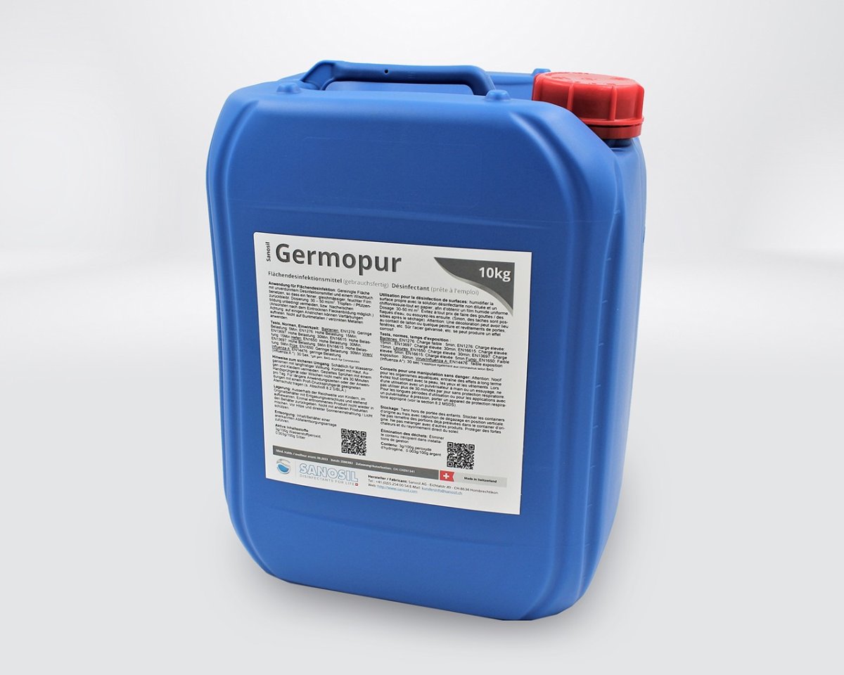 Sanosil Germopur est un désinfectant de surface à effet dépôt longue durée, reposant sur la formulation éprouvée peroxyde d’hydrogène / argent de Sanosil.