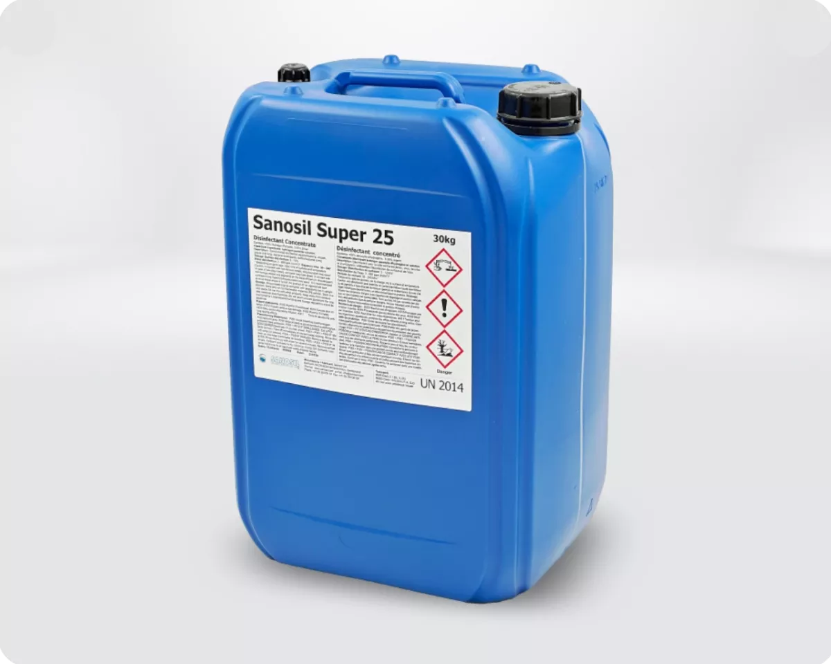 Sanosil Super 25 – PT2 (Désinfection de surfaces et locaux), PT3 (Hygiène vétérinaire), PT4 (Hygiène alimentaire)